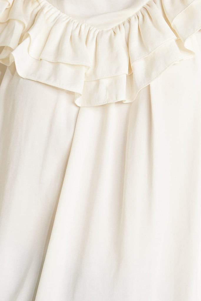• Features a high ruffled neckline, double chevron ruffled front, and long sleeves for a sophisticated, feminine silhouette.