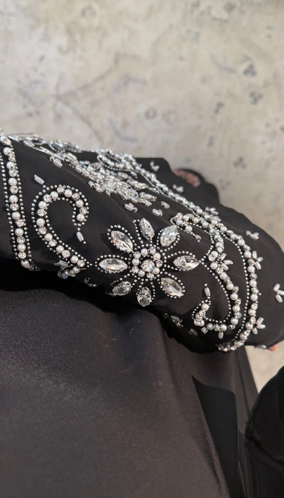 Blue abaya adorned with luxurious crystal stones on the sleeves, designed to catch the light with every movement. Wear it open or closed for versatile styling, with practical side pockets for everyday ease. Perfect for Ramadan or Eid, this statement abaya transitions effortlessly from day to night, dress it up or down and turn heads as the crystals shimmer in every room you enter. One size fits all.