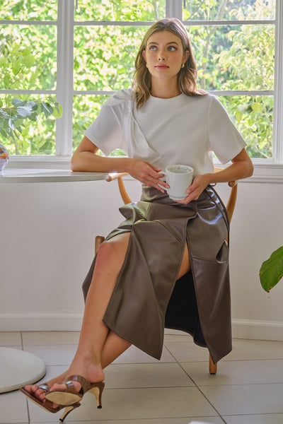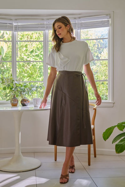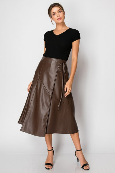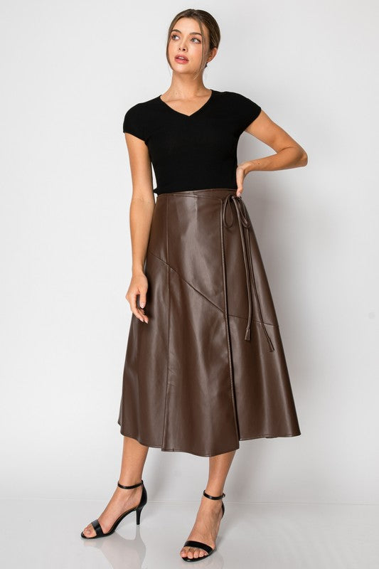 Faux Leather Wrap Midi Skirt with Self-Tie