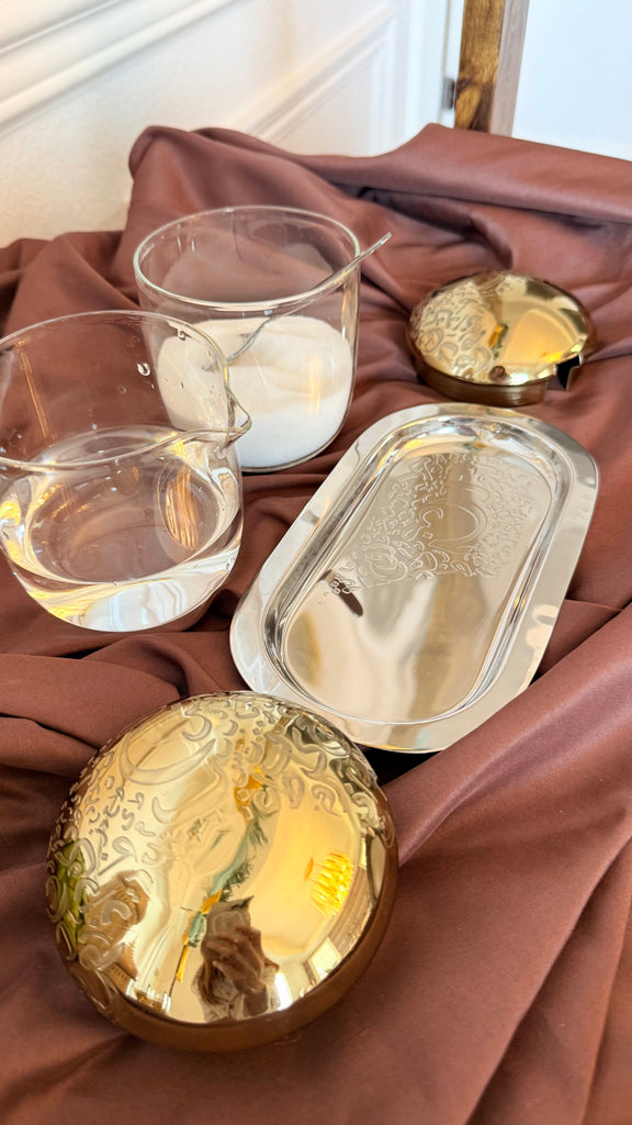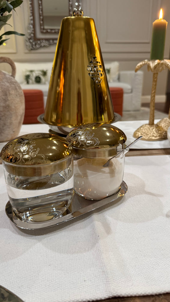 Elevate your Ramadan and Suhoor gatherings with this elegant 6-piece glass and brass set, featuring intricate Arabic calligraphy. Perfect for serving sugar and Qatr (Arabic syrup) in style, while adding a touch of tradition and sophistication to your table or home décor.