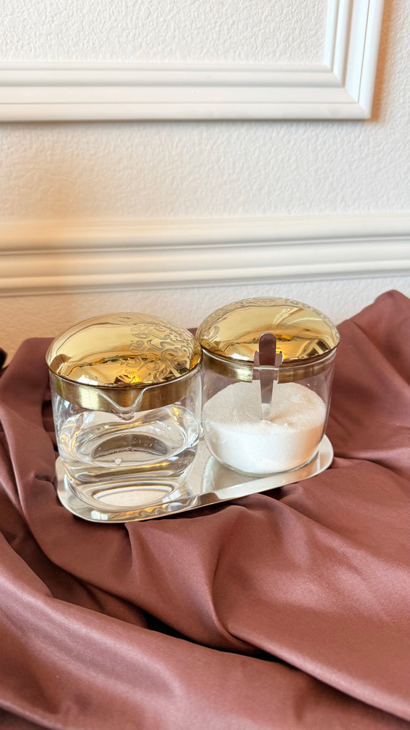 6-Piece Glass & Brass Set – Arabic Calligraphy Sugar & Qatr (Syrup) Set