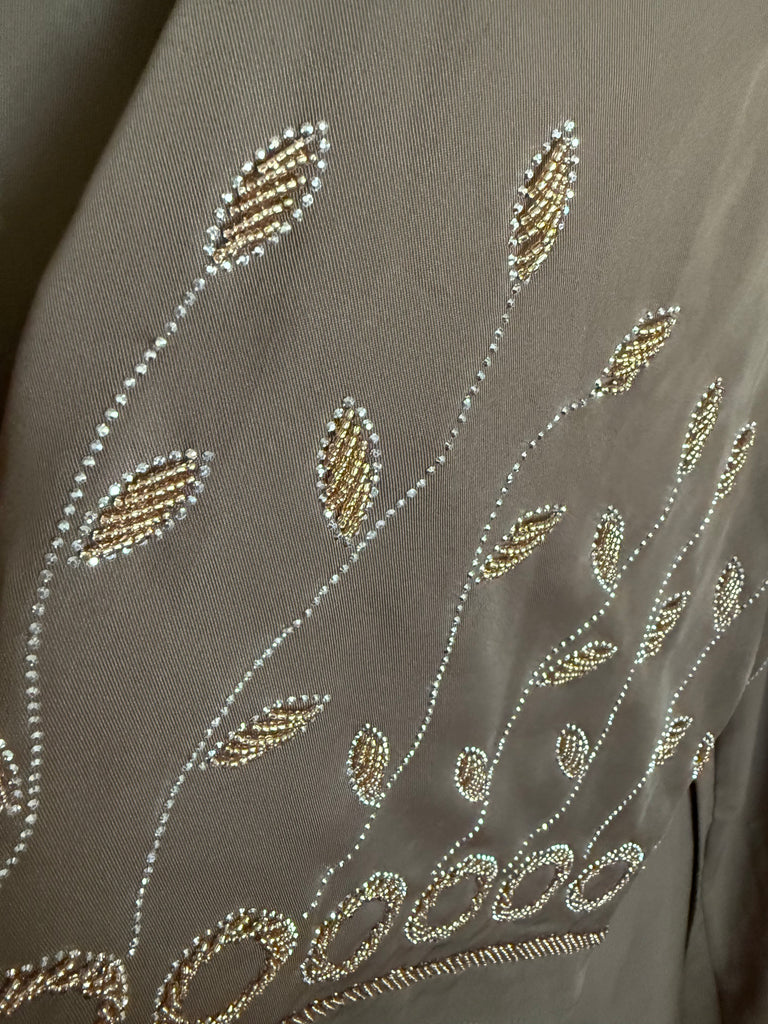 The sleeves delicate shiny beads, creating a textured, eye-catching detail that elevates the abaya with a subtle shimmer. Designed with a clean neckline, snap buttons, and convenient pockets, it can be worn open or closed, offering versatile styling options.