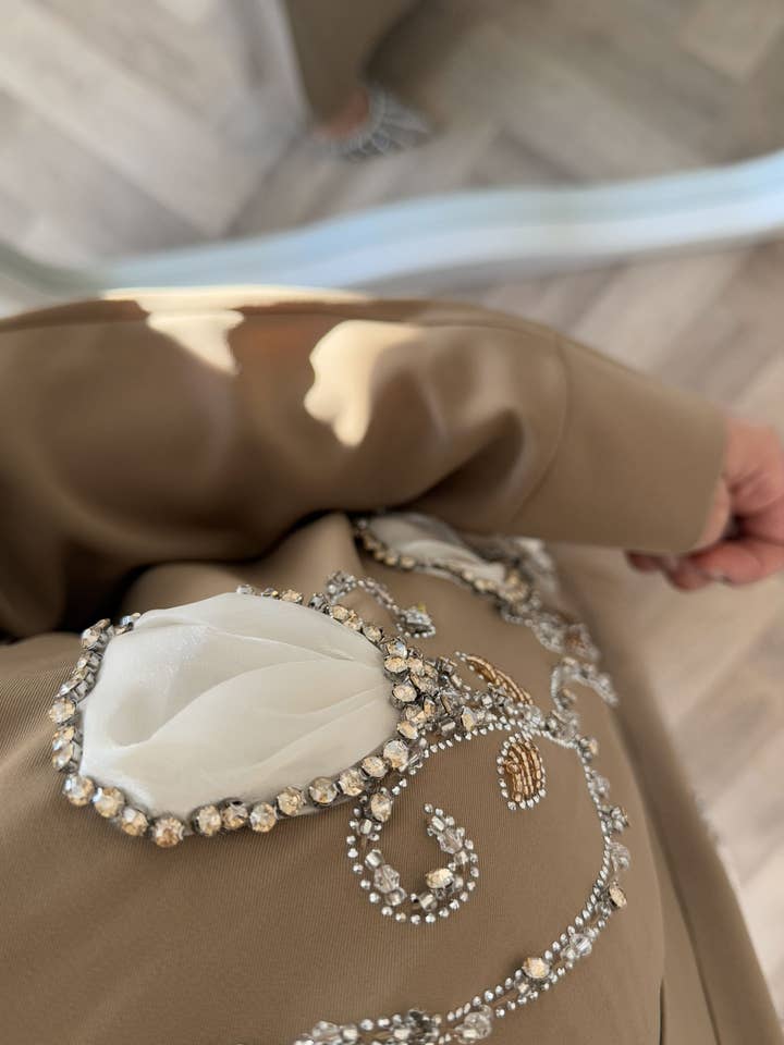 The front features 3D floral embroidery adorned with delicate beads, creating a textured, eye-catching detail that elevates the abaya with a subtle shimmer. Designed with a clean neckline, snap buttons, and convenient pockets, it can be worn open or closed, offering versatile styling options.