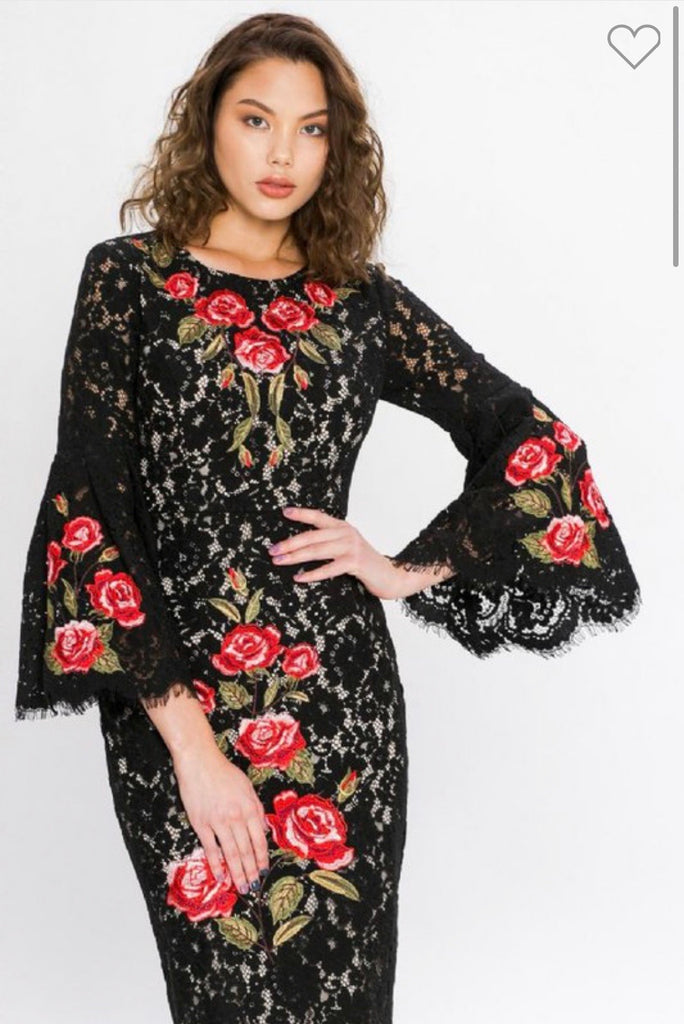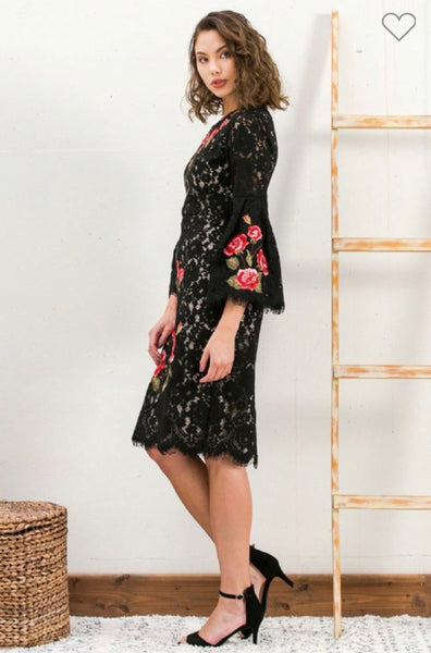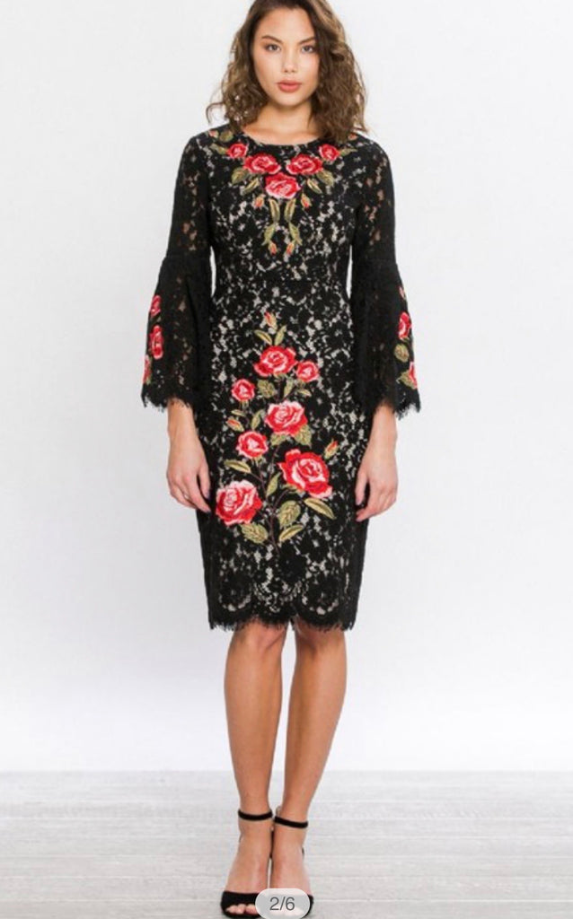 LACE MID-LENGTH BODYCON DRESS WITH FLUTED SLEEVES - FLORAL EMBROIDERY * APPROX. MEASUREMENTS: 34 1/2" IN LENGTH (SIZE SMALL) * SELF: 70% COTTON, 30% NYLON LINING : 93% POLYESTER, 7% SPANDEX