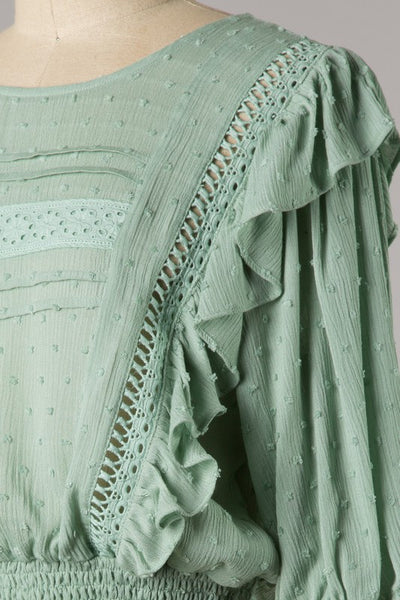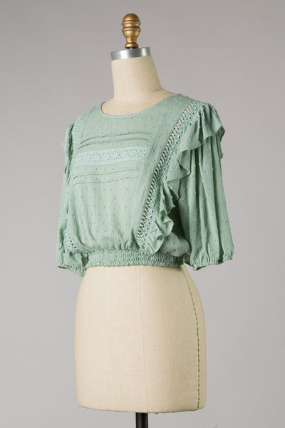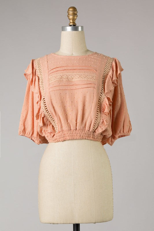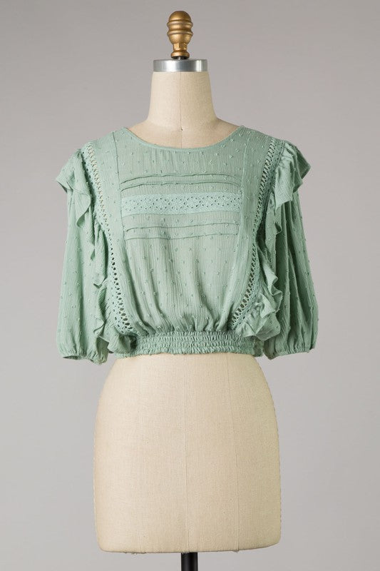 RUFFLED DETAIL SOLID WOVEN CROP TOP.